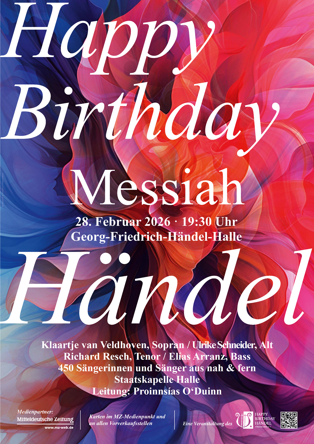 Am 28. Februar 2026 feiern wir den 341. Geburtstag von Georg Friedrich Händels, Halles großen Sohn mit einem prachtvollen „Happy Birthday Händel“. Wie schon seit mehr als 25 Jahren finden sich dafür rund 450 Chorsängerinnen und Chorsänger aus dem In- und Ausland zu einer festlichen Aufführung von Händels weltberühmten Oratorium „Messiah“ in der Händelhalle in Halle (Saale) zusammen. Konzertbeginn ist um 19:30 Uhr.